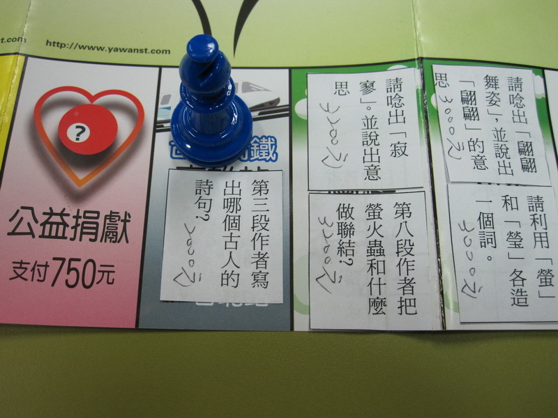 說明:藉由大富翁遊戲回答問題,增加學習動機。將坊間購買的大富翁遊戲改變內容就可以使用,但是只能用在四人為上限之小組教學。問題內容可包含識字或閱讀理解…等,依學生程度或教學材料而定。