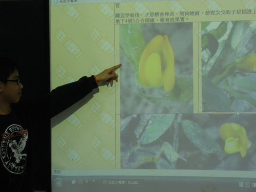 將全班分成5組,各組利用電腦查相關資料,並做成報告,利用彈性時間上台報告,最後由老師做總結,讓學生有更深層的了解,讓學生下學期在種植花生時,更有概念