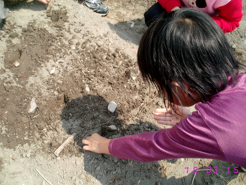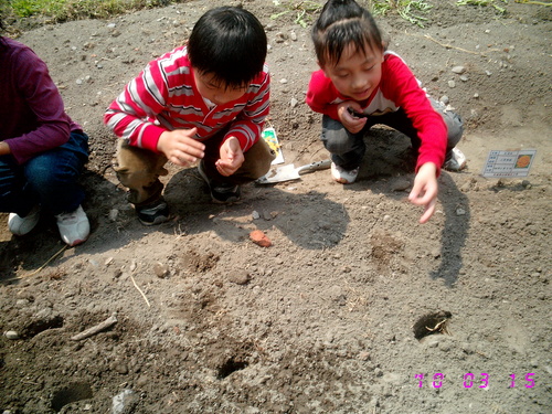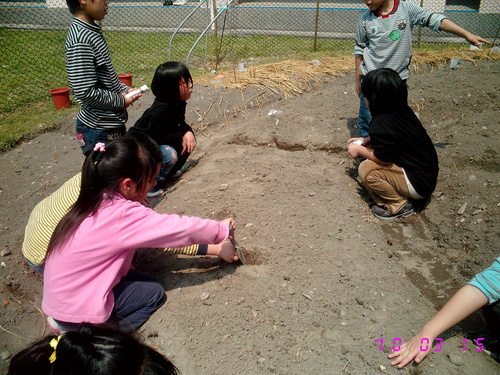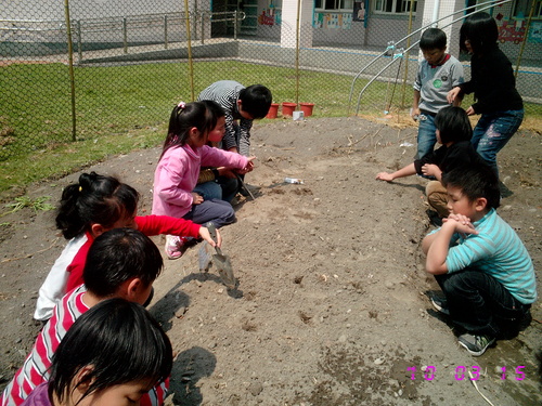 首先由劉主任為我們解說如何將花盆盆底黏貼膠帶,以防漏水。接著就由我們分組進行黏貼花盆孔洞的工作,綜合班塗國欽老師也出來協助我們。每次活動賴叔叔都會來幫我們的忙,真是感謝他!叔叔將原水生池裡的植物剷進盆裡後,就由大家一起將花盆搬到綜合班北側走廊旁的空地上擺好。