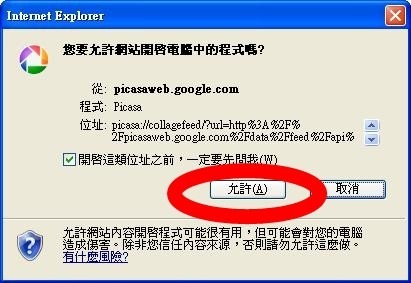 按一下"製作美術拼貼","允許" Picasa 程式執行