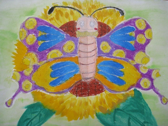 運用此主題學習對稱的概念。 是否發現?蝴蝶的身體有一條摺痕。我門就是利用這一條摺痕與蠟筆印染特性,繪製兩邊一模一樣的翅膀。