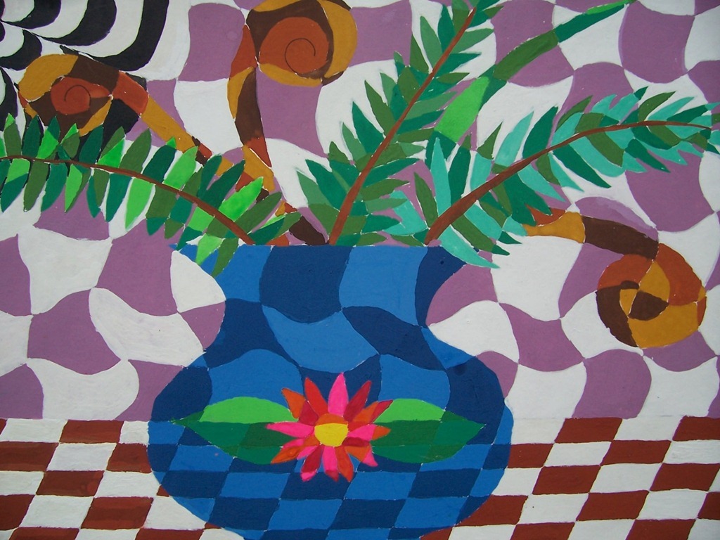 利用厚紙板條剪裁簡單圖形,固定底端於畫紙中央,依八方位描繪圖形輪廓,再依其對稱區塊排列設計色彩。 背景顏色應與主題形成對比。