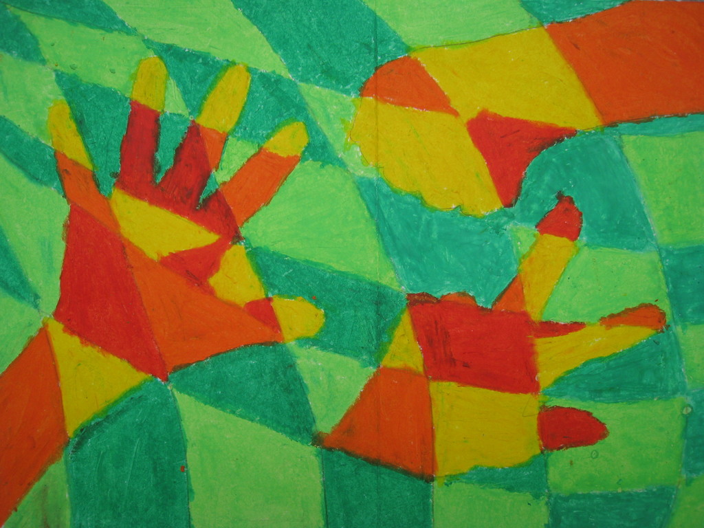 手能變出什麼花樣呢? 97年時,設計以單一手印繪製,並以線條切割區塊並將相鄰的兩區塊塗上不同顏色,手印和背景也以不同顏色表示。 98年時,在這個教學主題中,更加上色系的認知,體驗顏色給人的...