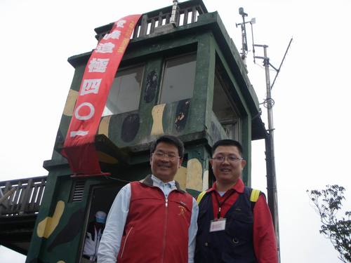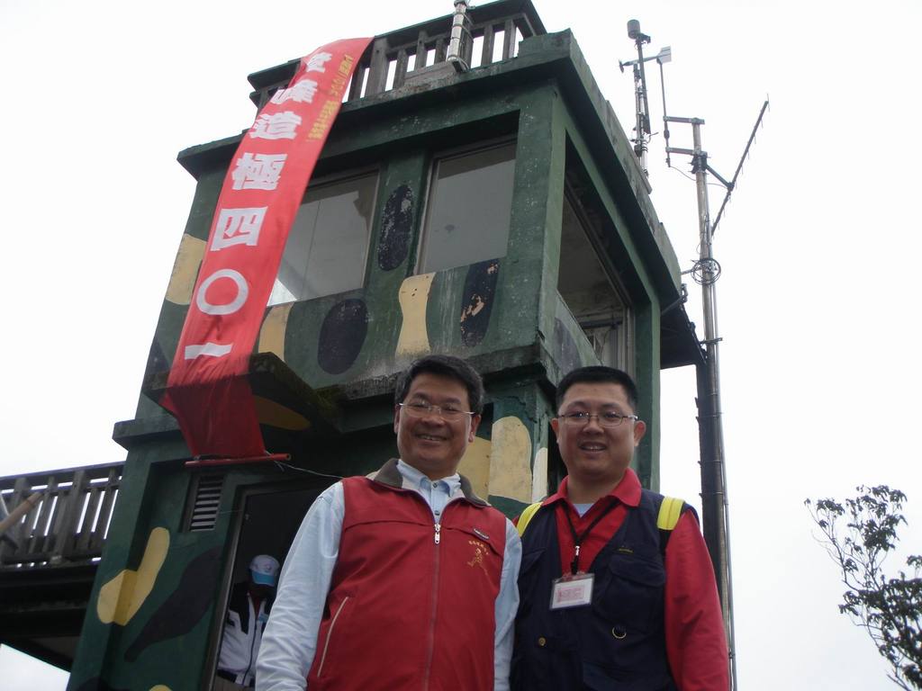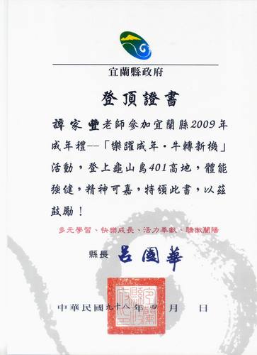 我校的師生已先回轉下山,為了怕事後被說是我沒有走到終點,我趁各校都走完後,留在最後,請旁邊的記者先生,替我和呂縣長合影(縣長此行陪伴我們,在終點處一一與各校留影,體力充沛。)。我那張登頂證書,可不是浪得虛名,我也是勤勤懇懇爬到底的,雖然是慢得太多了。