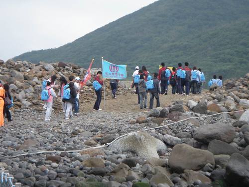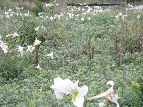 我們的船在島南邊龜尾的碼頭登岸,我踏上龜山島的關鍵時刻是九點四十一分。我校的隊伍是我們主任前導,我跟在後頭忙拍照。島上的一切樣樣都新鮮,我注意到有好一大片的臺灣百合,這在本島似乎不易見到。