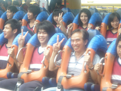 雖說是年輕人的最愛,但我們的老師可是不落人後,依然向自我挑戰,請看林棖踰主任和同學們搭上「飛天潛艇G5」車的英勇照片。本遊樂設施結合高度、速度及驚險度三冠王的驚險,名稱中的G5即代表在由65米高空,停頓3秒鐘後,以110km/hr俯衝向下,人體瞬間須承受五個重力加速度的考驗。玩這項遊戲的遊客,少有不尖聲怪叫者,但我們林主任說:「只消眼睛一閉,就這麼衝下去,幾秒鐘一下就過去了,一點都不可怕。」