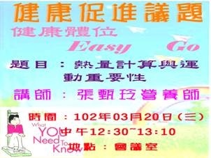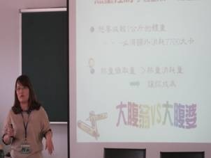 一、2-1-1 101年健康享瘦俱樂部課程內容(二):學員營養認知課程 由 李明姿 · 2013 年 4 月 15 日 101年健康享瘦俱樂部課程內容(二):學員營養認知課程活動2—營養認知課程一、時間:102年3月20日二、地點:1樓會議室三、實施對象:健康享瘦俱樂部成員,共計12人四、講師:全順營養師張甄玲五、教學內容:介紹體重過重及肥胖的定義、熱量及需求量的計算方式、簡單說明幾種減重的方法及檢重迷思的釐清、陳述肥胖的原因及減重的三要素、辨明營養素與食物之關係、說明為何需要運動及減肥的運動處方…等等。六、活動照片: