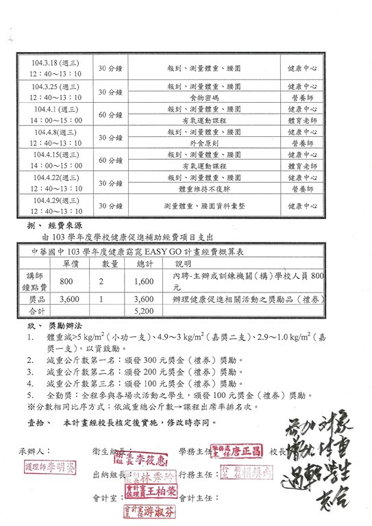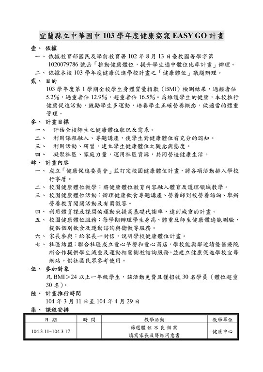 103學年度健康窈窕EASY GO計畫暨成果 由 李明姿 · 2015 年 3 月 18 日 104.3.28食物密碼觀看投影片全部下載 104.4.1體能活動觀看投影片全部下載104.4.8外食原則觀看投影片全部下載104.4.15體能活動觀看投影片全部下載104.4.29享瘦不復胖觀看投影片全部下載