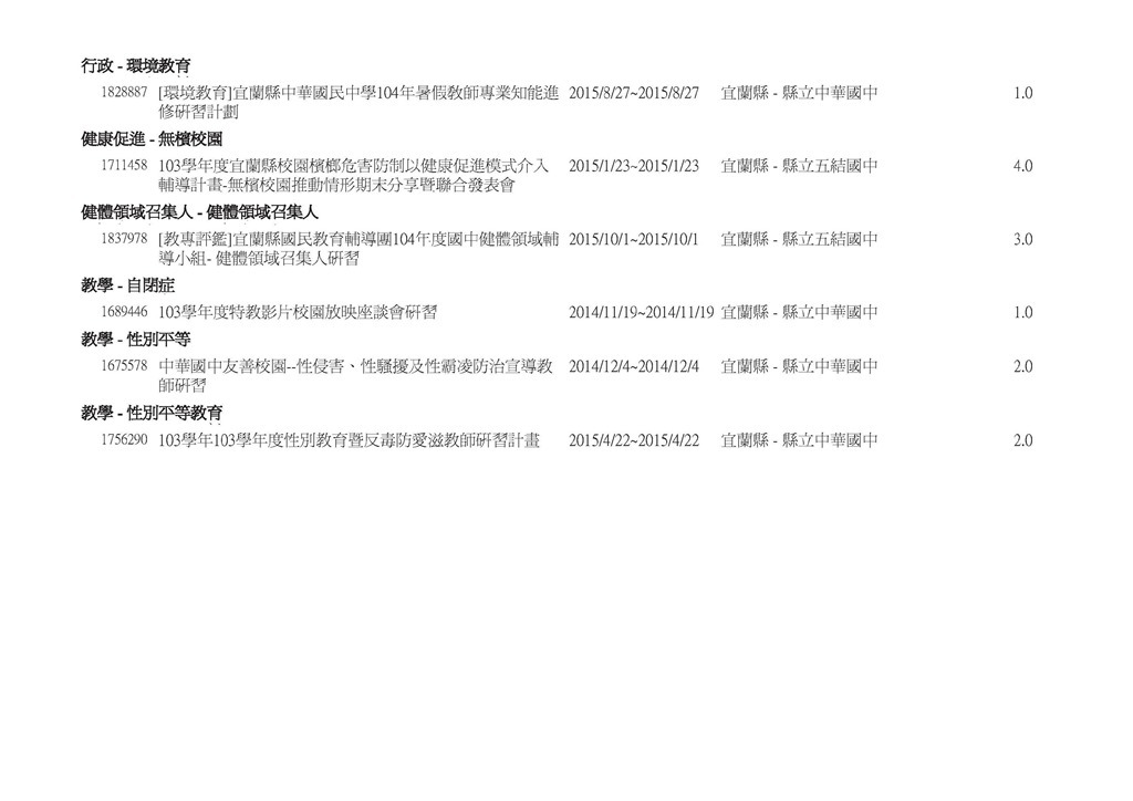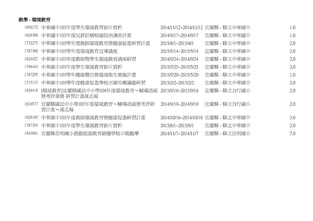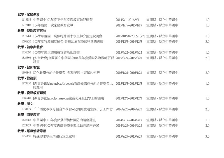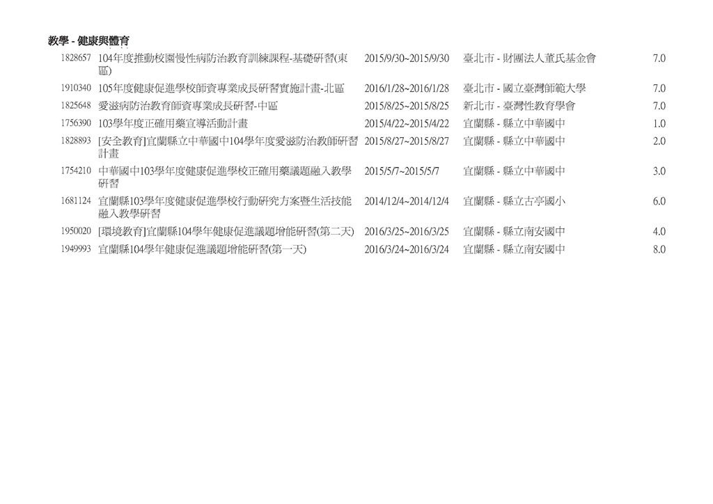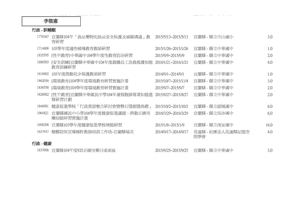 4-2-4 健康教育授課教師有參與專業在職進修,每二學年至少參加學校衛生相關研習十八小時 由 李明姿 · 2016 年 4 月 21 日 104學年度班級數:37班健康教育授課教師共2人李筱惠老師(專任)相關研習時數合計:139小時呂怡秀老師(專任)相關研習時數合計:46小時