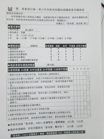 愛.青春進行曲~青少年性教育校園巡迴講座意見調查表