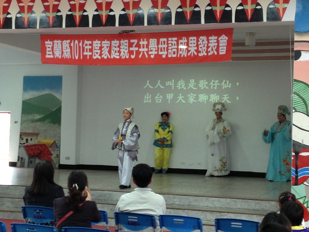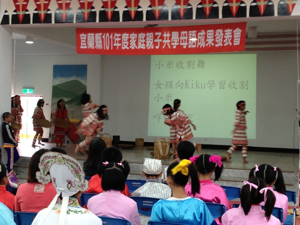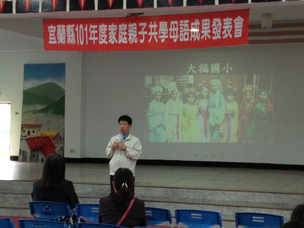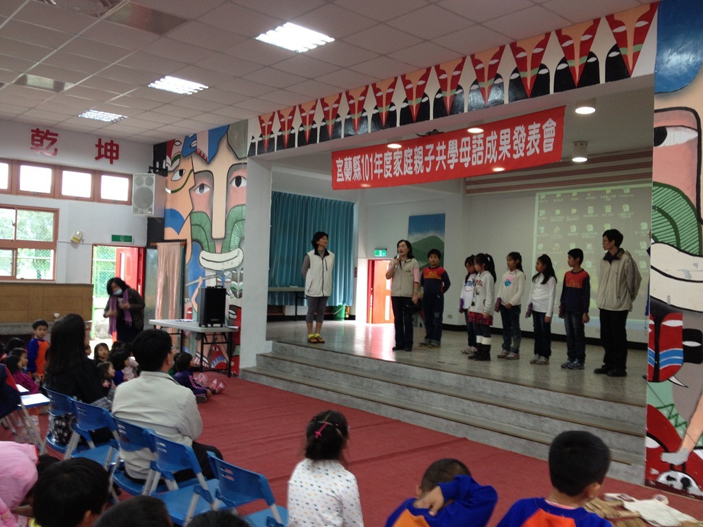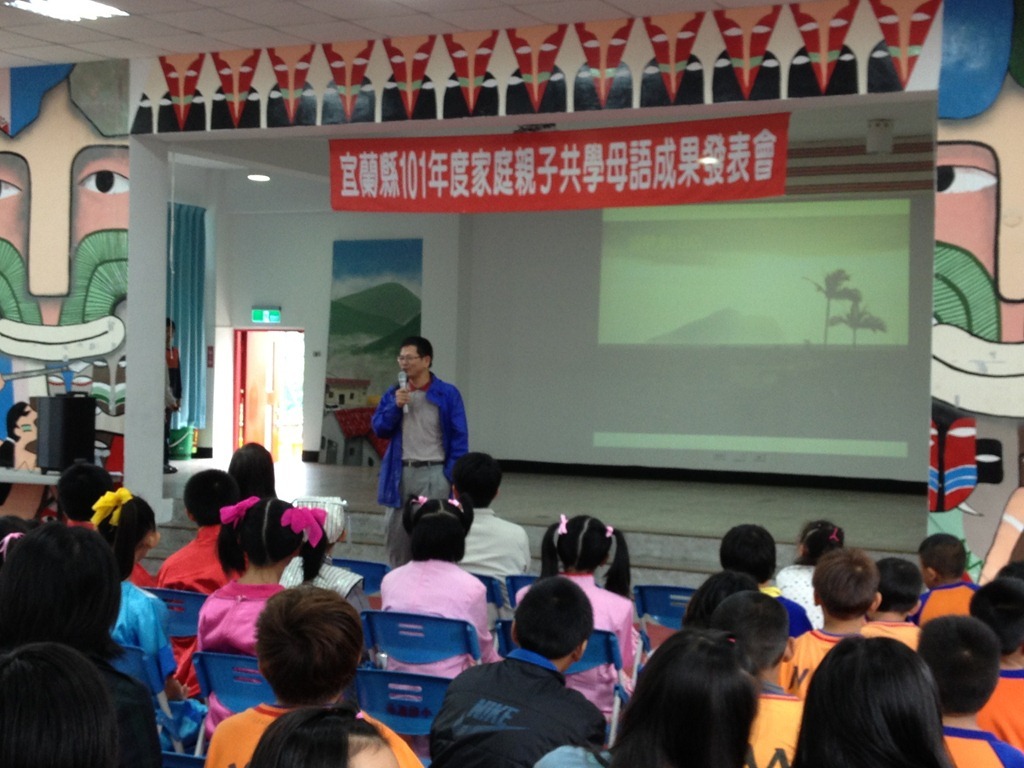 宜蘭縣101年度家庭親子共學母語成果發表會作者:t8607332012 年 11 月 19 日2021 年 3 月 18 日地點:南澳國小風雨教室參與學校:南澳、大福、頭城國小 南澳國小–泰雅語大福國小:河洛語頭城國小:客家語