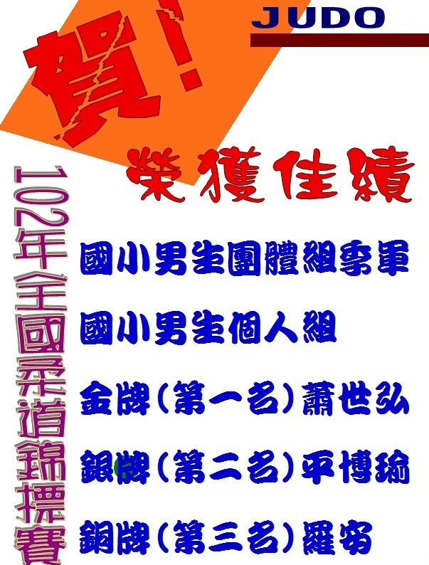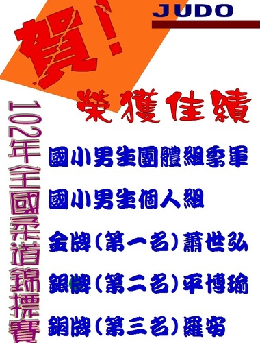 賀~本校柔道隊榮獲102年全國柔道錦標賽國小男生團體組季軍(第三名)