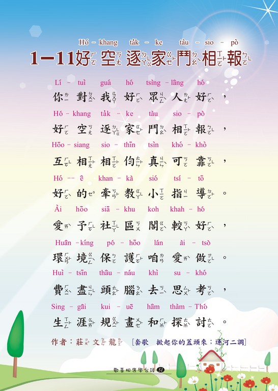 歡喜相褒學臺語,輕鬆好耍真趣味,網站放送來做起,傳教簡單閣順利。簡單好學的相褒歌是精緻臺語文化中,相當珍貴的一項資產;如同歌仔戲的七字仔、四句聯,出口成歌,每句押韻,是相當通俗的白話詩,日常生活對話,見景取材,即興創作,趣味性高,把看到的、聽到的馬上入歌,隨即唱出,就好像張帝的急智歌曲一樣,也好比曹植七步成詩一樣,還可以呈現多元的音樂風貌;還可以用活潑的歌仔戲調如歡喜玉玲瓏的狀元樓、留傘調…相褒調、吟詩調、民謠、囡仔歌、東西洋名曲、現代流行歌曲、對口相聲、答嘴鼓、RAP等,呈現多元的音樂風貌。吟唱歌詞內容包羅萬象,以傳統七字仔,押韻的相褒歌及自創歌詞介紹給學生,使能聽、說、讀、寫、作、演、吟、唱。設計創新、好學、好記的自編學習教材。作品可吟唱,能善用音韻特性,結合律動,提供生活化、趣味化、活潑化且正確之教學設計,方便學生自我學習。增進臺語教學之活潑性,並發揮多媒體教材、資訊融入教學的優點,豐富教學內涵,引發學生學習意願,提升臺語能力,輔助語言學習,有效提高學生學習意願及成效。作品題材設定、單元安排與教學設計符合初學臺語程度的原則。吸引學習者的創意與趣味性,激發繼續學習的興趣。希望有機會能讓臺語的美繼續流傳下去。以自創歌詞介紹給學生,適合進入學校教導小朋友,譬如宜蘭風景真正好,李子好吃粒粒酸…等,即時即景的歌謠,可吟唱.可朗讀,可表演,可配合學校本位課程,發展學校特色,節慶表演都非常適合。 評量方式:聽懂、會講、讀唸、記寫、團體創作、演唱。寫出心情感受,去憂解煩的作品。 講師E-Mail:Win3798@gmail.com 部落格**臺語相褒歌 教學站--歡迎逐家相招來相褒** https://2blog.ilc.edu.tw/3860/2009/07/16/%e8%8e%8a%e6%96%87%e9%be%8d%e8%ac%9b%e5%b8%ab%e7%b0%a1%e6%ad%b7/ 我的名叫莊文龍,佇教臺語衝衝衝,鼓勵學生來欣賞,傳承智慧世界強, 認真拍拚向前衝,若有缺點小原諒,好的建議會聽從,互相相挺來褒獎, 眾人意見定尊重,分工合作相參詳,建設言論來呼籲,學生乖巧逐家暢。 臺語教學到如今,全面推動如火急,教育事業有愛心,敬業精神負責任, 骨力充實袂放鬆,觀摩學習會上網,交換經驗來開講,有樣看樣比平棒, 交流互動勤研習,需要逐家緊匯集,教材教法來編輯,臺語活水捷補給, 教學研究做完備,佇教臺語真順利,互相鼓勵佮支持,開創臺語好時機。 學生朋友學臺語,大聲開喙上歡喜,會曉讀冊唸歌詩,這款快樂無底比, 唸歌算是好代誌,讀了若熟加捌字,功課咱若做完畢,閒閒通好唸歌詩, 人講酒逢知己飲,若好詩句會友吟,眾人學習真有心,臺語園地歌詩吟。 熱愛臺灣文化,有心改造社會風氣!