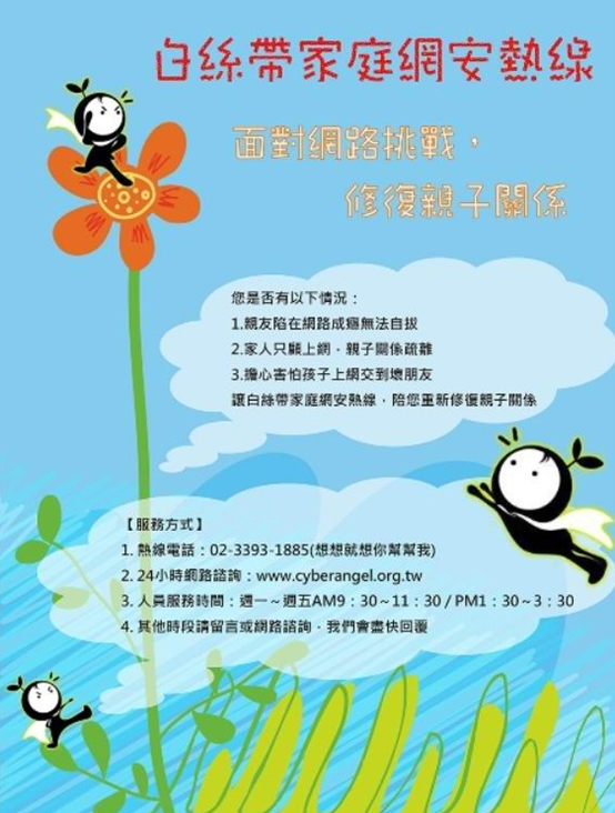「白絲帶家庭網安熱線」提供網路成癮諮詢服務專線,長期關注青