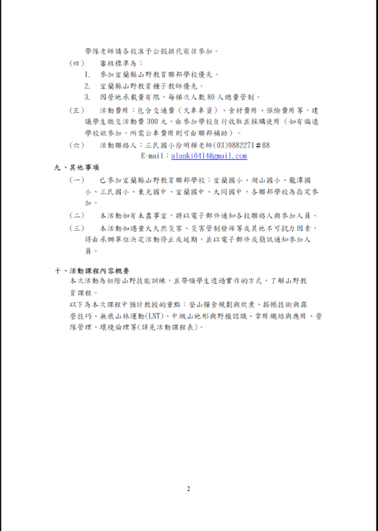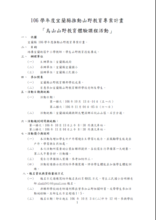 106-1-1-6本府辦理106學年度宜蘭縣推動山野教育專案計畫–「烏山山野教育體驗課程活動」計畫1份。Post author:mariaPost published:2017 年 10 月 2 日Post category:行政與管理 相關內容104-環境教育委員會及工作職掌2015 年 9 月 2 日106-1-1-4「2017年真開心農場食農教育計畫活動簡章」文件1份,請查照。2017 年 10 月 2 日3-1-1校園綠化美化情形植樹活動2018 年 9 月 26 日