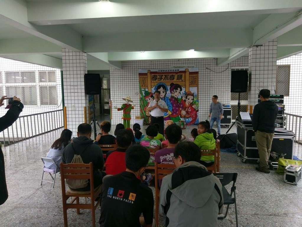 推出第十齣新戲「孝子不孝『順』」在風雨中到四季國校英士分校進行校園