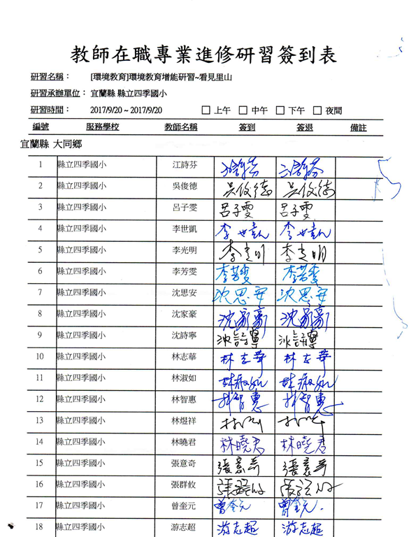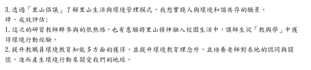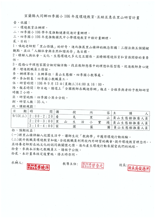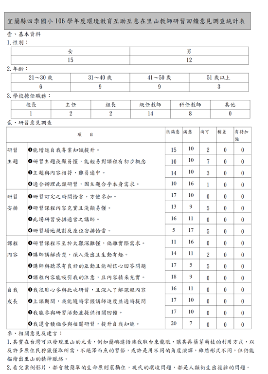 106-2-1-9辦理互助互惠在里山環教研習Post author:mariaPost published:2017 年 11 月 8 日Post category:教學與宣導活動1.研習計畫:2.研習簽到簿:3.回饋意見調查及成效評估分析:4.活動照片: 相關內容105-2-8-4守護梵梵溪生態之美2016 年 11 月 1 日107-1-4-1環教認證合格人員推動環教工作2018 年 9 月 25 日鄉聯合進修原住民文化教育研習—拳頭姆步道2014 年 11 月 18 日