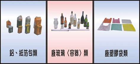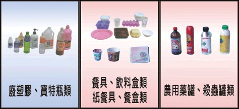 1.寶特瓶、鐵罐、鋁罐、鋁箔包、鮮奶紙盒、塑膠容器、玻璃瓶、餐盒、