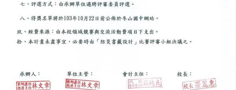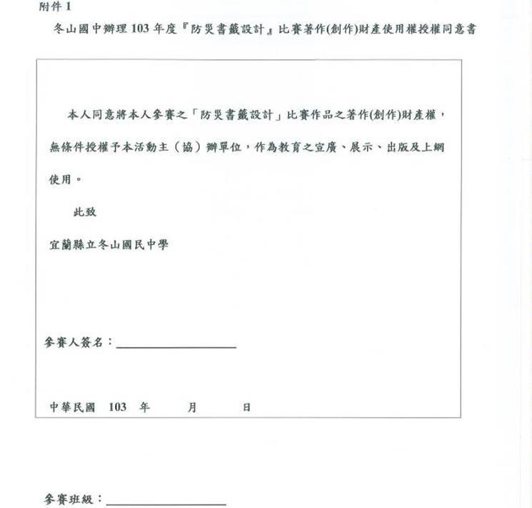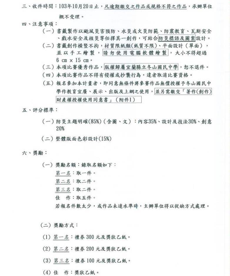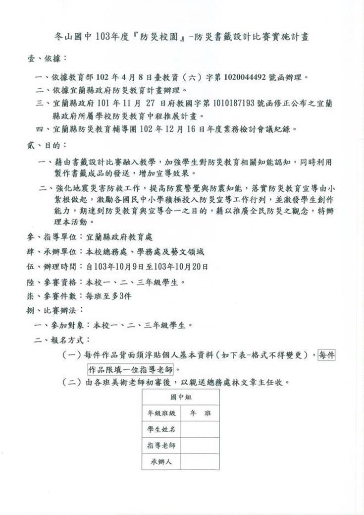 宜蘭縣立冬山國民中學103學年度『防災教育』-防災書籤設計比賽成果10月29日週會時請校長頒獎