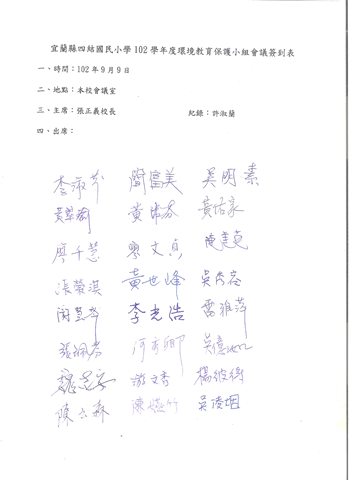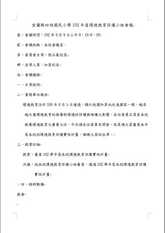 召開102年度環境教育推動小組會議Post author:許淑蘭Post published:2013 年 9 月 9 日Post category:公告 / 活動照片 / 行政與管理 / 計畫一.實施計畫 二.環境教育推動小組會議會議記錄 三.會議影像記錄 許淑蘭宜蘭縣礁溪鄉四結國小環境教育成果網相關內容106年度食農活動教育計畫2017 年 3 月 16 日有備無患不怕震 (四)2019 年 11 月 2 日108年低年級校外教學—羅東林場2019 年 6 月 1 日