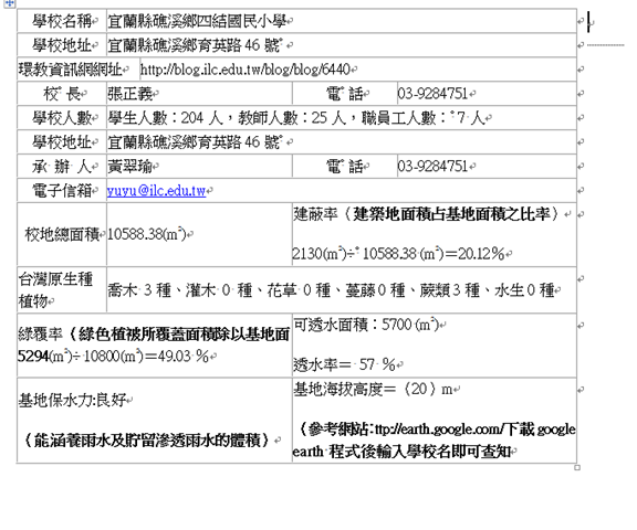 106年學校基本資料Post author:黃翠瑜Post published:2017 年 11 月 11 日Post category:公告 / 自評表 / 行政與管理相關內容參與推動宜蘭綠卡-我是環保小尖兵2016 年 11 月 11 日推廣食農教育2017 年 11 月 7 日102年度四結國小教職員工節能減碳研習-騎自行車遊冬山河2013 年 9 月 25 日