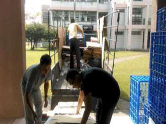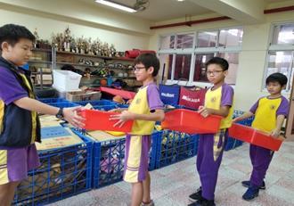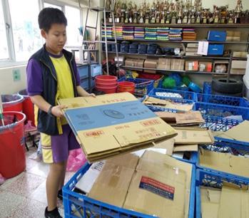 學生排隊等待回收 | 環保小志工協助紙類回收 |