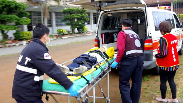 照片說明:於災區中救出學生乙名,並請護理師進行急救固定包紮。