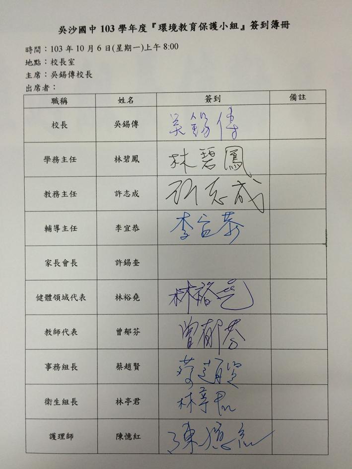首先感謝各位同仁撥空與會,一起研議商討環境教育的推動,近年來環境教育已不只是社會新興的教育議題,更是我們希望融入全校師生的項目之一。本校長期以來皆對環境教育議題有相當程度的著墨,對於校園環境的清潔與維護,本人亦身體力行,強力督導,願以身作則當全校環境教育的領頭羊。另各處室皆用心辦理相關活動,諸如:從防災演練、綠色博覽會及利澤焚化爐參訪、畢業旅行的科博館、后豐自行車鐵馬行、廣興紙寮;吳沙社區鄉土實察、草嶺古道鐵健行、蘭陽博物館之參訪、千里光產業參訪等,使得環境教育的概念無形深植於所有師生心中。此外,本人對於行政團隊的用心也衷心的感謝,此外環境教育線上考評亦請負責處室用心準備,務必讓大家看到吳沙國中長期致力於推展環境教育的用心。