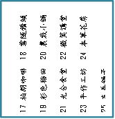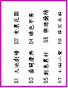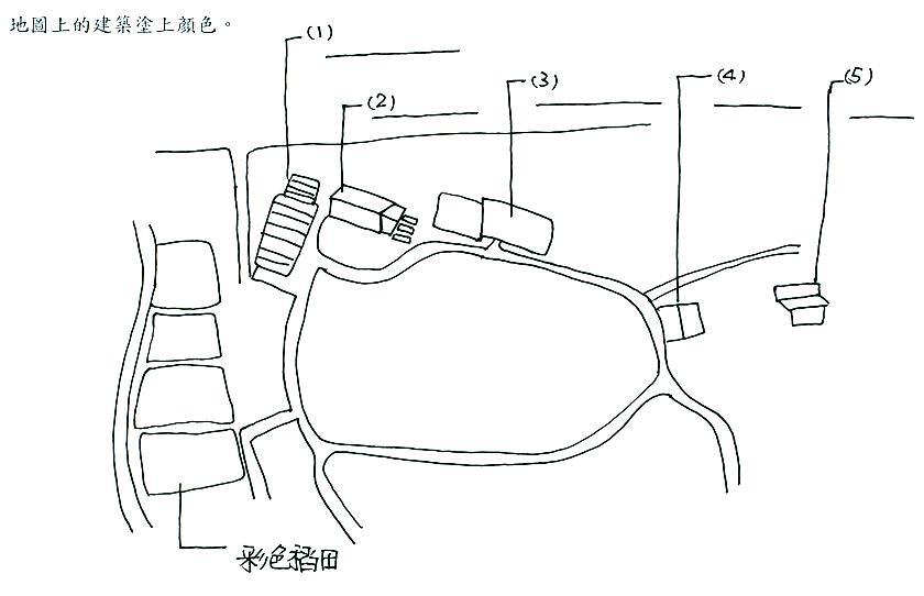 1. 下圖是「微笑聚落」的地圖,請你在下圖空白的地方(共5處)填上建築物的名稱,並依你現場所見,幫地圖上的建築彩色稻田塗上顏色。你知道在彩色農田中,農夫種了哪幾種的米?趕快去問問志工叔叔或阿姨,並記錄在圖中吧。