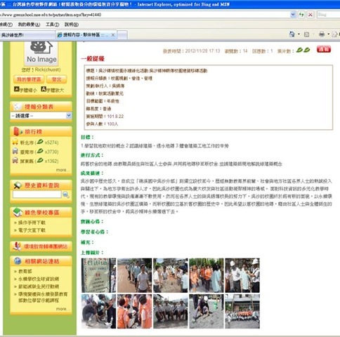 簡介: 「宜蘭縣立吳沙國民中學校舍新建工程」98年11月份開始進行設計規劃,100年2月工程開工,於今年10月完工,陸續將進入驗收階段。建築工程結合節能與綠建築,並考量身障者需求,設計全區無障礙環境。在建築施工與材料選用上,建築工程主結構為RC搭配鋼結構屋頂,配合當地環境採自然通風採光,施工工法上也採源頭減量及資源重複利用的設計,營造出對學生及社區友善的教學環境,獲得宜蘭縣公共工程優質獎與金質獎入圍的殊榮,因此宜蘭縣政府於101年11月15日(星期四)下午14時,邀請建築師團隊與本校辦理全縣工地品質管理現地觀摩交流、分享經驗,一起打造優質的教育環境。
