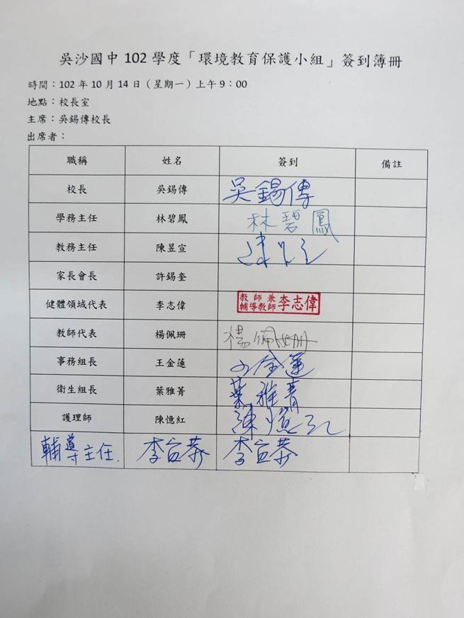 承辦人:卓聖倉 學務主任:林碧鳳 校長:吳錫傳