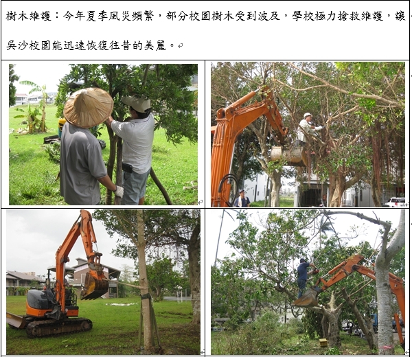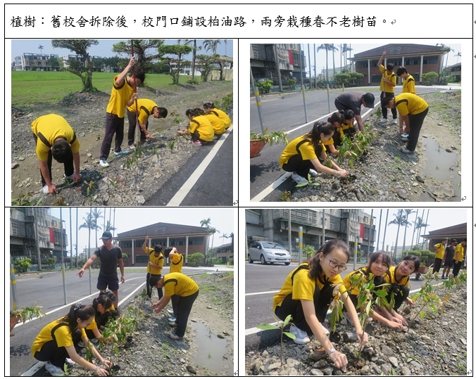 六、 照片說明:開學至今,學習服務社同學已進行四次校園清潔工作,他們針對校園內較容易被忽略的區域作整理,默默為環境清潔貢獻一份心力。