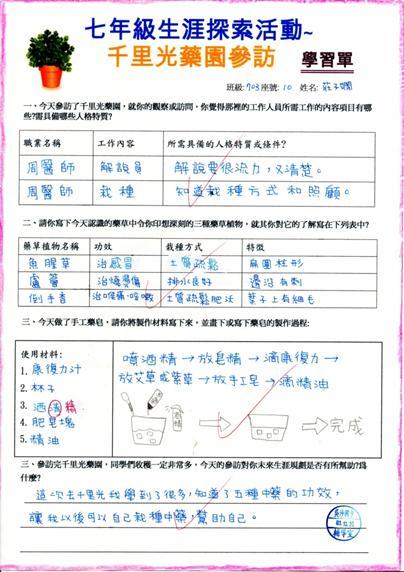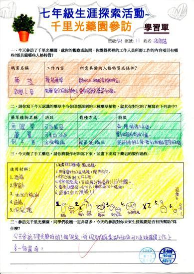 實施歷程紀錄(簡述:包括與領域課程的連結(指標)、規劃方向、實施前、後討論檢討、建議事項。 | 本次學生共分為四組,分別就「山之層」、「平原層」、「海之層」及「時光廊」等主題撰寫學習單,多樣化的學習單讓學生參訪蘭博的過程中,相互切磋討論,找尋解答,讓此次活動也確實發揮應有的教育功能。本次課程融合了多元領域,包括:自然、藝術與人文、社會及國語文領域等,例如自然領域-蘭陽平原的地層變動、形成及水文地貌;藝術與人文領域-蘭博建築外觀及舊時生活相關工具;社會領域-蘭陽地區發展史;國語文領域-宜蘭民間俗諺等,藉由參訪學習課堂上所無法獲得的知識,也期待學生能將課本所學之事物運用在日常生活中。 | |||