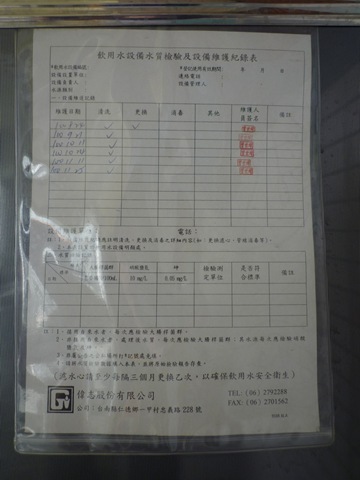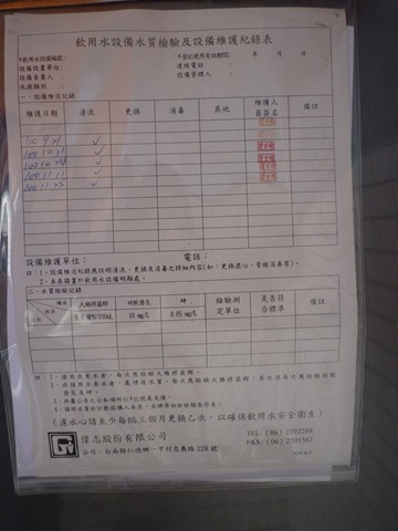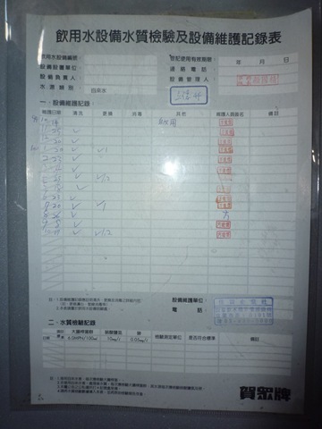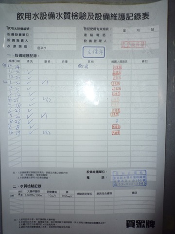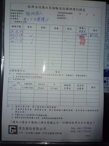 飲水機定期清理、維護、水質檢驗Post author:huang67119Post published:2011 年 12 月 7 日Post category:校園環境管理 / 活動照片 / 行政與管理本校飲水機設備位於1.勤學樓2樓 2.勤學樓3樓3.勤學樓4樓4.立德樓2樓5.立德樓3樓6.立德樓4樓定期維修和檢查紀錄如下圖-> ↑飲水設備定期維護照片 ↑立德樓2樓 ↑立德樓3樓 ↑立德樓4樓 ↑勤學樓2樓 ↑勤學樓3樓 ↑勤學樓4樓相關內容100清淨家園打掃社區活動2011 年 12 月 6 日109 3-1-1-3 校園綠化美化情形-增設運動器材2020 年 11 月 4 日節能減碳推動情形2011 年 12 月 6 日