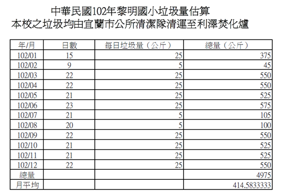102-垃圾量估算Post author:linpfPost published:2013 年 11 月 7 日Post category:行政與管理相關內容環保小尖兵研習2010 年 9 月 18 日105_1-2_環境教育簡介2016 年 11 月 17 日1081-1 108學年度資源回收及一般垃圾收集時間公告2019 年 11 月 17 日