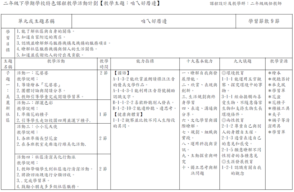 104-2-8-二年級活動-咱ㄟ好厝邊Post author:linpfPost published:2015 年 10 月 22 日Post category:教學與宣導活動目的:讓學生動手清潔校園周邊環境,鼓勵學生進行愛社區服務,從而體會環境維護不易,需要大家一起努力。時間:104/04/14地點:學校周邊社區 相關內容108 2-2-5 結合羅東林管處之員山生態教育辦理108年八哥屬鳥類公民科學課程2019 年 11 月 14 日101_五年級校外教學計劃2012 年 11 月 26 日109 2-2-11 結合員山生態教育館,進行種子DIY課程2020 年 11 月 6 日