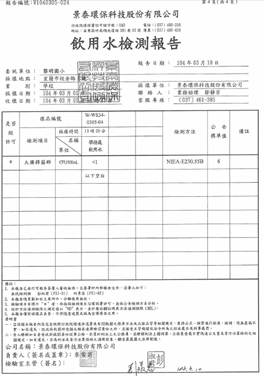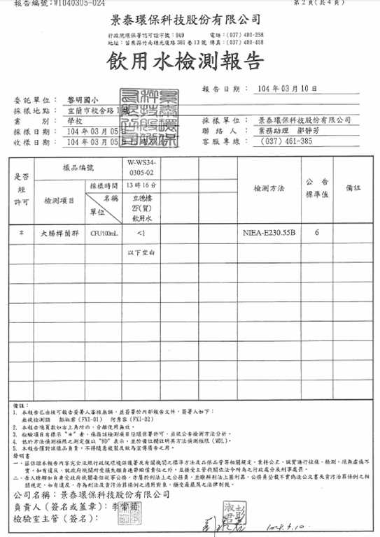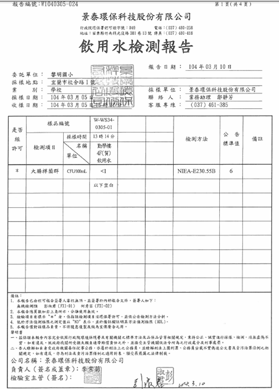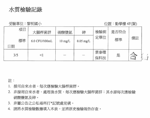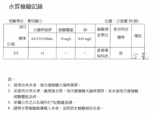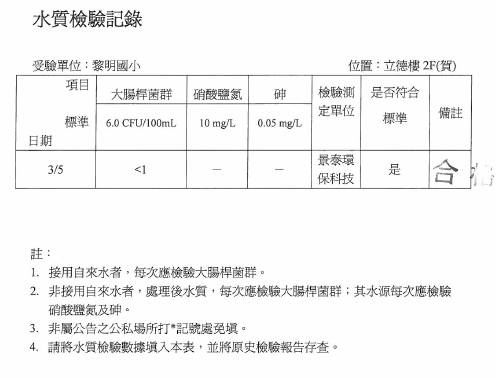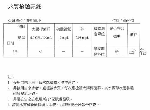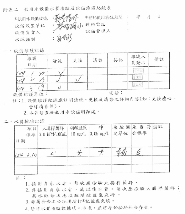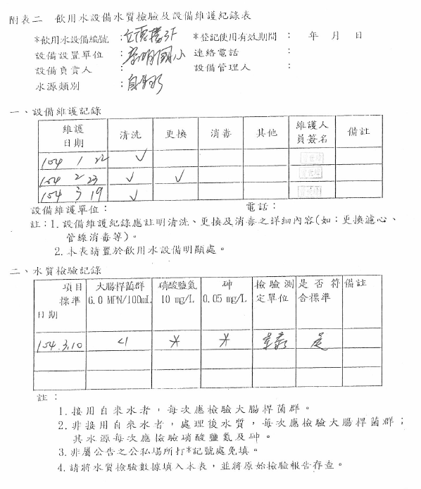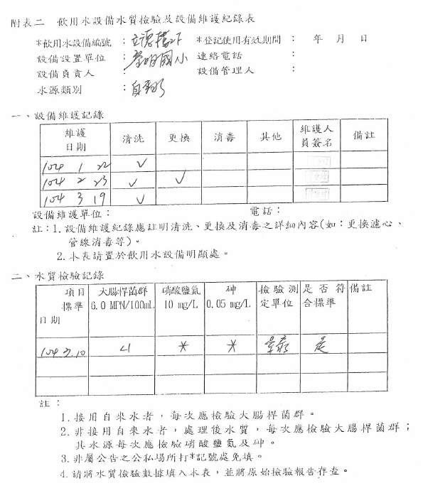 104-3-6-飲水機定期維修保養Post author:linpfPost published:2015 年 11 月 9 日Post category:校園環境管理飲用水設備水質檢驗及設備維修紀錄表 飲用水檢測報告 水質檢驗紀錄 飲水機維修、清潔相關內容107_3-2-2 空氣品質警示方式及宣導2018 年 11 月 10 日十一月份優良公廁頒獎2010 年 12 月 7 日實施環境教育課程-搭配三年級自然課程-認識校園植物2011 年 12 月 7 日