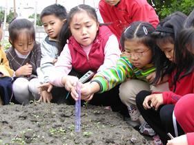 運用教學農園,指導學生親手播種油菜,並觀察生長過程,測量作物高度