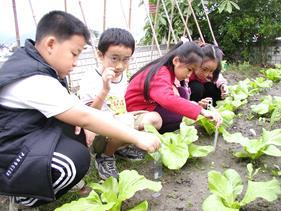 - 栽種後的蔬菜、水果與全校師生共同分享。