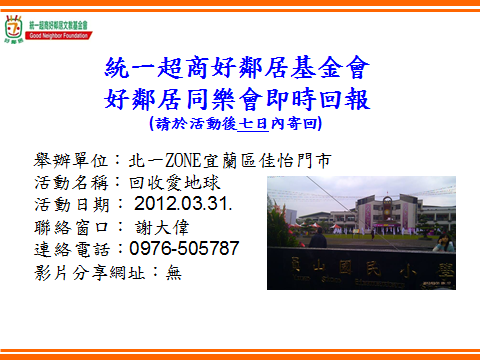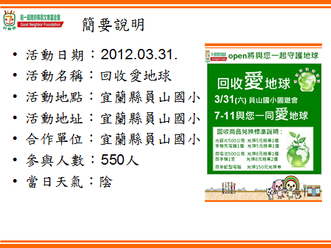 101年,於校慶園遊會時,結合統一超商蒞校設攤,進行闖關活動,推動環境教育。