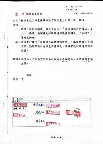 二、為落實行政院「機關綠色採購推動方案」,本校特訂定旨揭方案,期能帶動社會綠色消費風氣,定確實達到環境保護之效益。
