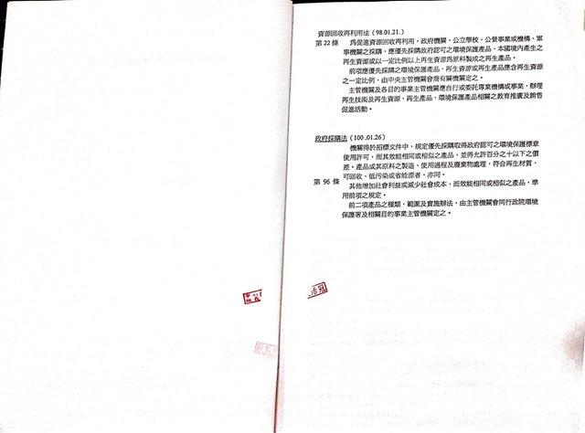 一、依據:「政府採購法」第九十六條、「資源回收再利用法」第二十二條及「機關優先採購環境保護產品辦法」等辦理。