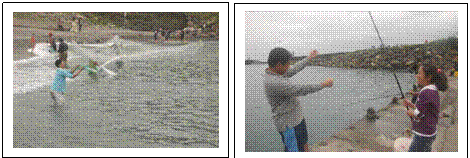 魚類食材獲得方法,如垂釣、牽罟、八卦網、漁船捕獲等,因大坑罟社區牽罟機具損壞無法作業,改以其他方式體驗。農曆3月是洄游性魚類-鯷魚俗稱(科ㄜ仔)豐盛期,帶領學員生到海岸邊,體驗垂釣與八卦網即可獲得食材的體驗學習。