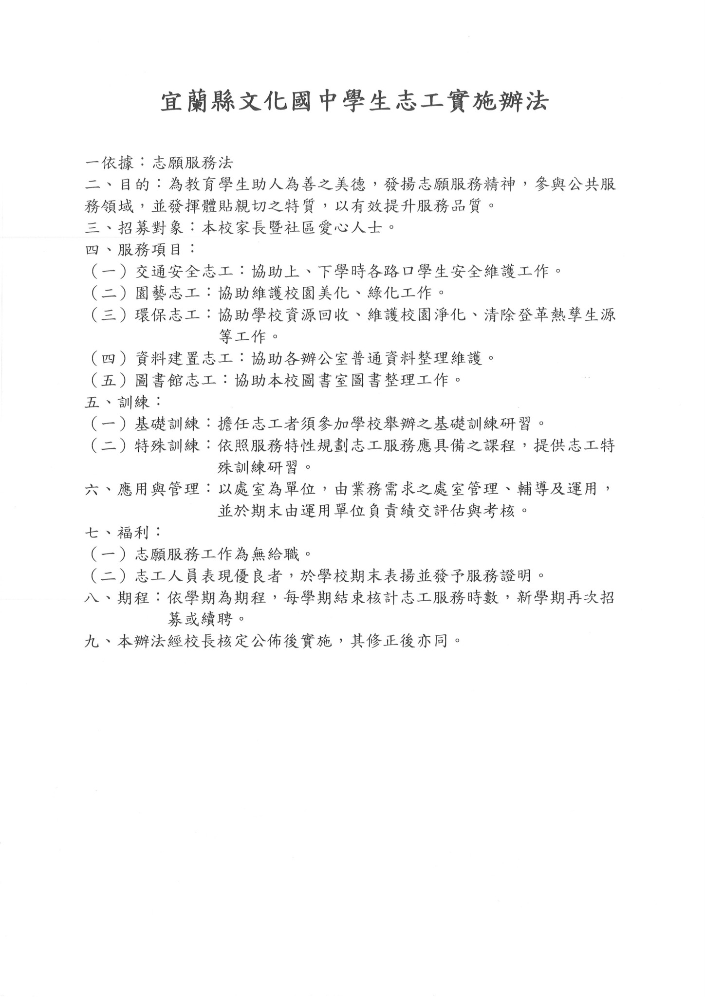 1、 訂定「宜蘭縣立文化國中學生環保義工服務實施辦法」
