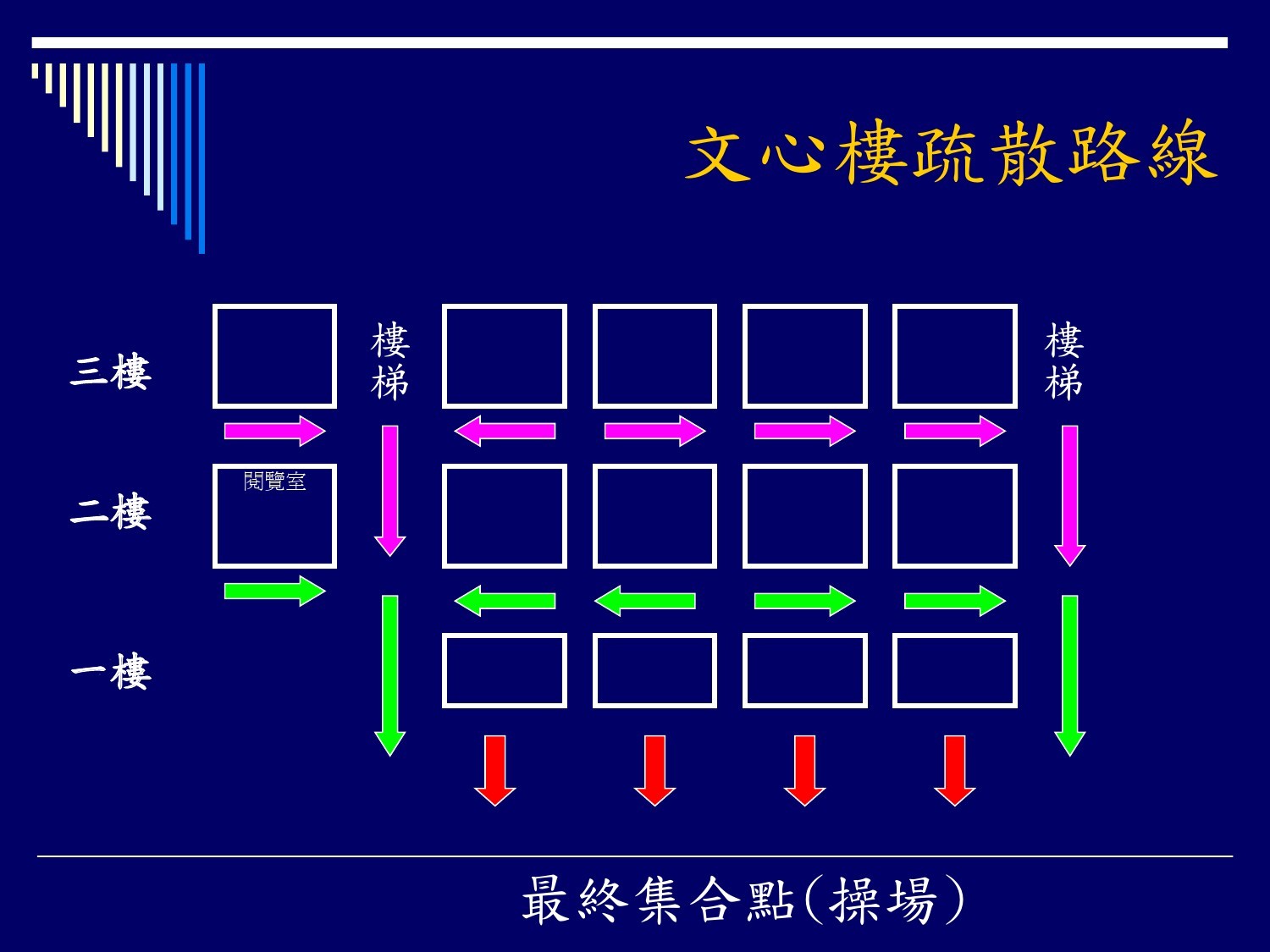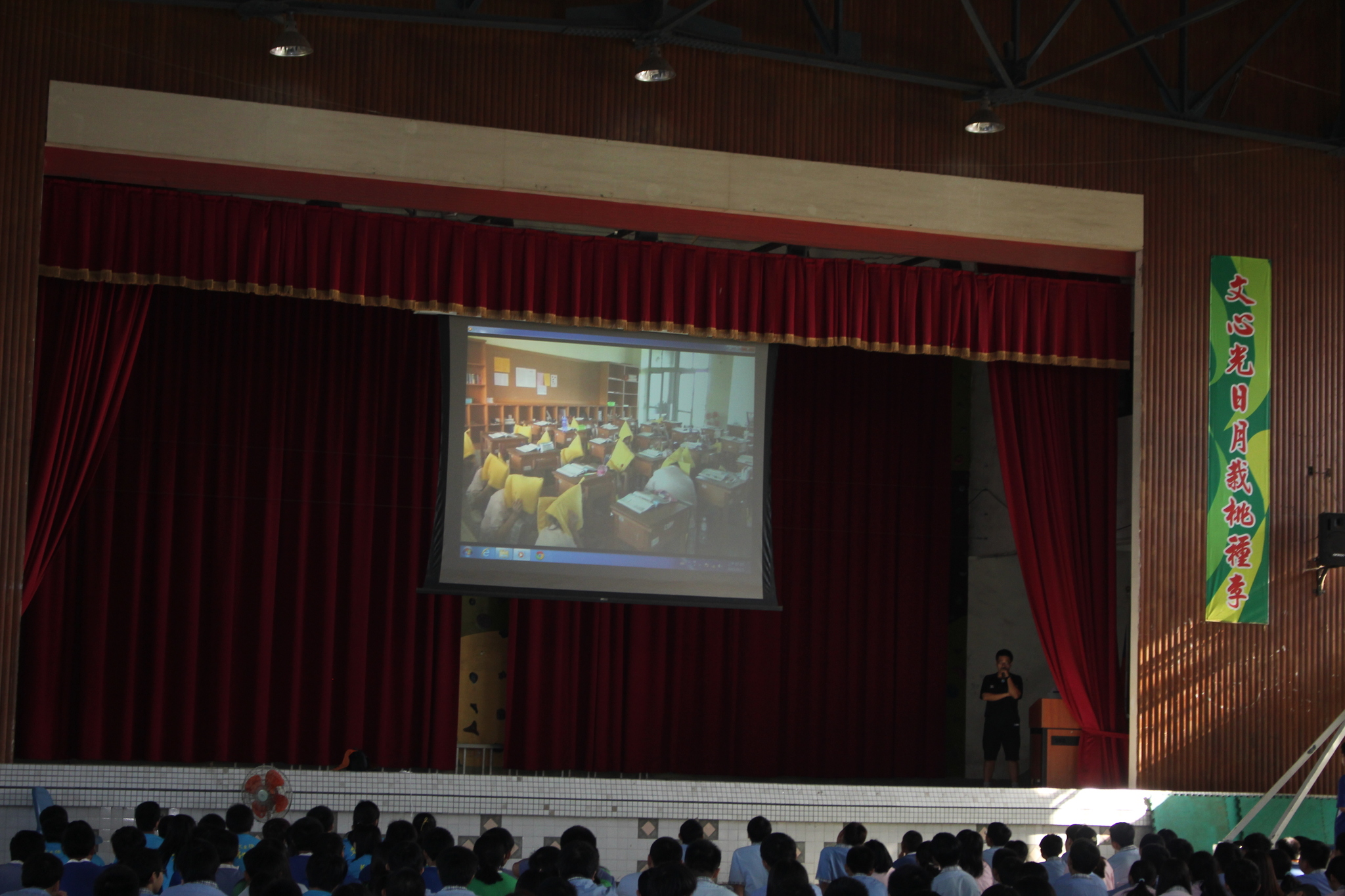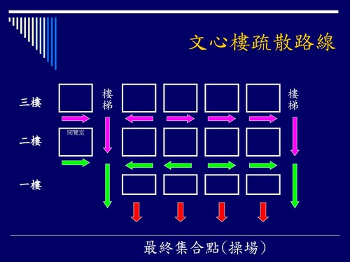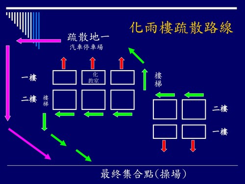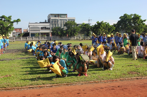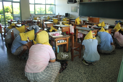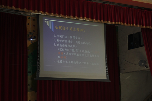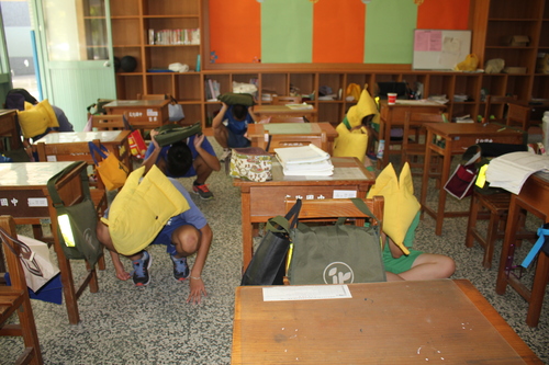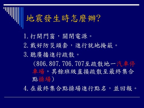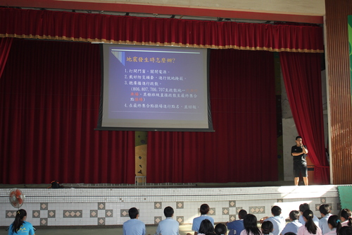 發佈於 17 9 月 201518 3 月 2021 作者: u1102219104_二.2.辦理逃生演練照片說明:逃生宣導簡報於體育館宣導各種逃生注意事項,並觀賞去年逃生演練的影片模擬地震發生時實地掩蔽,戴上防災頭套並躲避於課桌之下俟地震停止後,學生沿事先規劃的逃生路線進行逃生並於操場集合點名確認傷兵名單