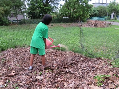 落葉集中處理製作堆肥 | 在落葉堆中加入橘子酵素,加速腐熟程度 |