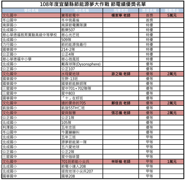 學生及教師分別組隊參加宜蘭縣節能源夢大作戰,共有五隊榮獲節電績優獎