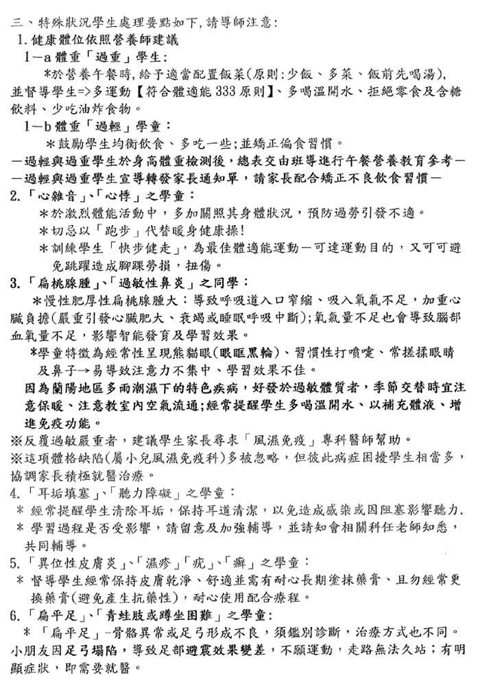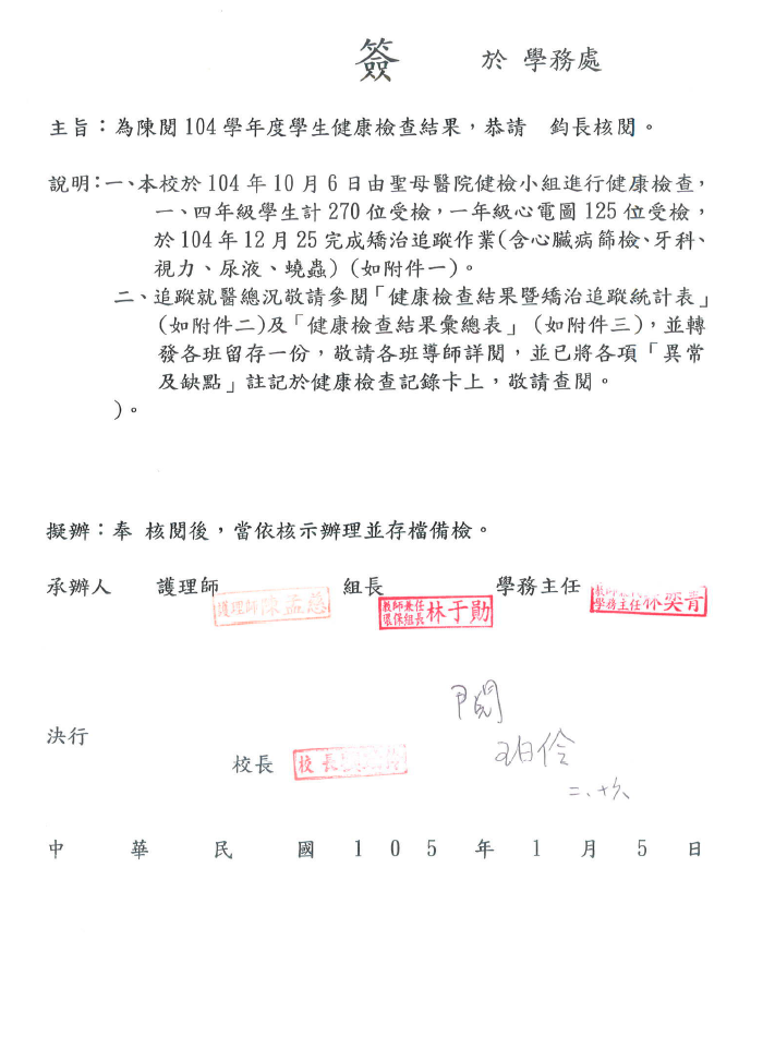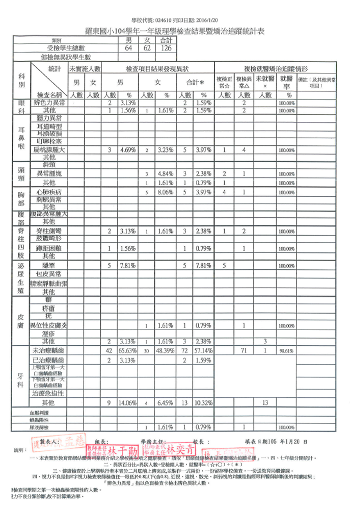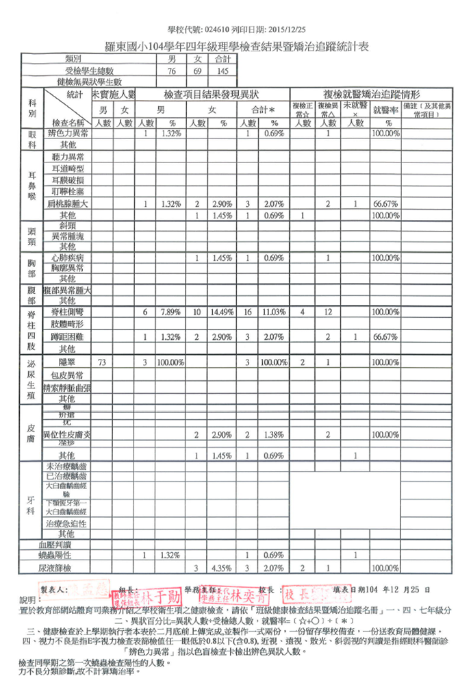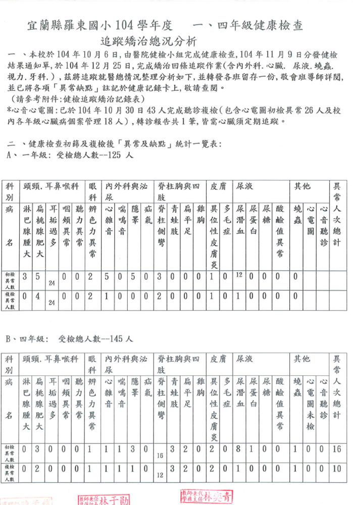 104學年度學生健檢結果簽核、各年級統計表及追蹤分析表。