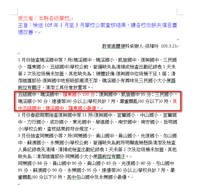 本校依規定執行公廁檢核項目,榮獲教育處抽測檢查100分。