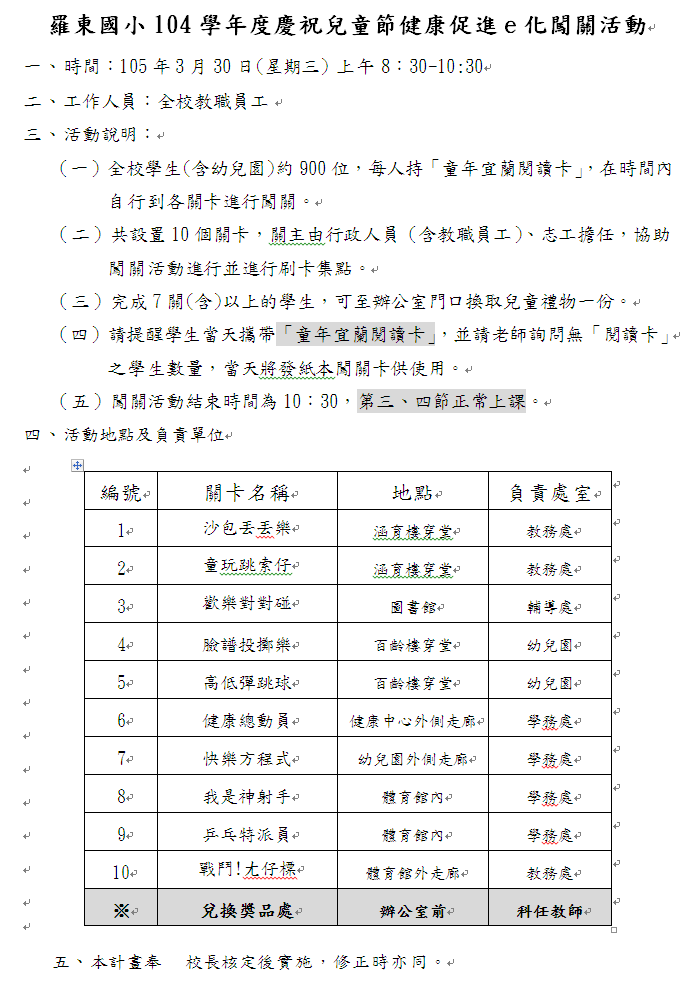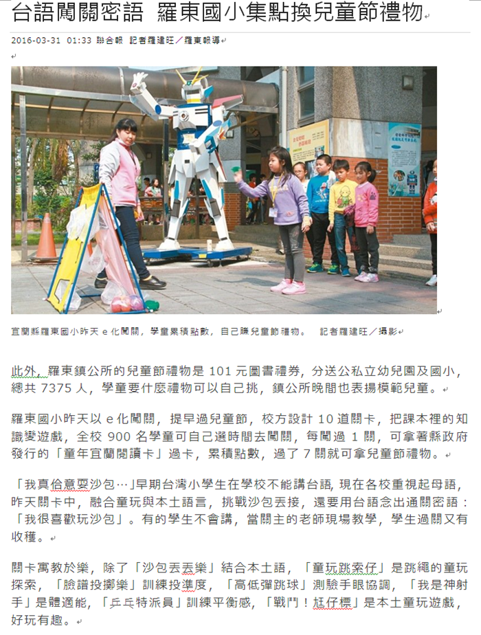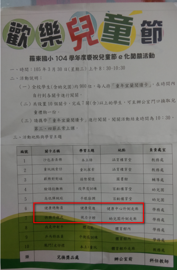 兒童節健促闖關活動作者:lut2016 年 4 月 5 日今年兒童節本校以健康促進為主題,結合E化刷卡集點,並邀請本校保健志工及衛生所專員進行健康促進各項議題宣導活動。今年活動更獲得聯合報刊載,受到廣大迴響。一、日期:105年3月30日二、地點:羅東國小三、參加人員:本校全體師生、家長及志工、衛生所人員四、活動計畫五、活動海報六、活動照片結合衛生所人員辦理健康促進各項議題活動結合e化闖關,將闖關活動運用閱讀卡刷卡證明本校兒童節活動獲聯合報刊載